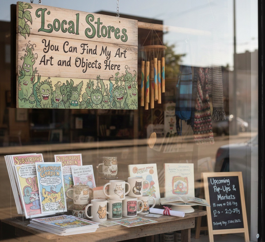 I believe art belongs in the world—on your walls, in your hands, and even in your coffee mug. While many of my projects are one-of-a-kind, you can find a curated selection of my Subversive Garden prints, Practical Art, Art and Writing at the following local retailers.